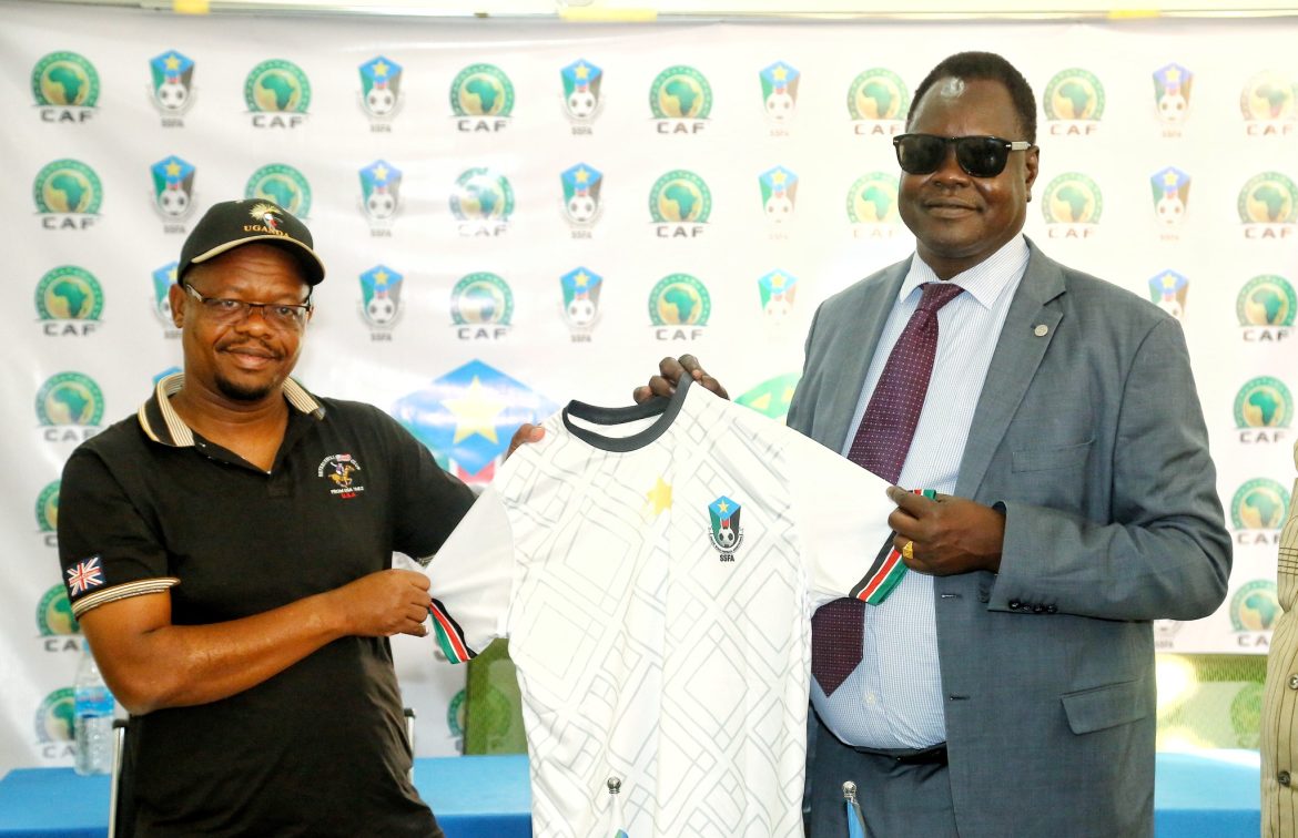 The President of SSFA, Augustino Maduot (Right) presenting Bright Star jersey to the FUFA President, Moses Magogo Hassim (SSFA Images – 28th November 2022)